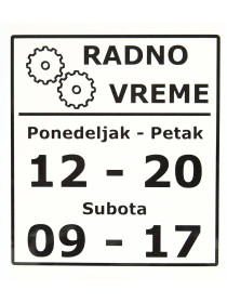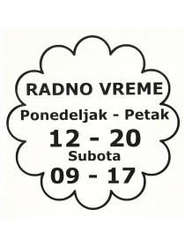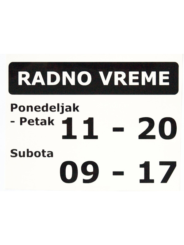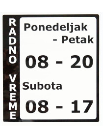 Radno vreme - izrada i prodaja nalepnica za ulazna vrata radnje ili firme - dimenzija je oko 19x25 (može biti manja ili veća). Radi sa na samolepljivoj foliji koja se prenosi na ulazna vrata sa spoljnje ili unutrašnje strane vrata tako da samo slovo ostaju na vratima. Boju birate prema svojoj želji a raspložive boje su crna, crvena, plava, žuta ili bela.