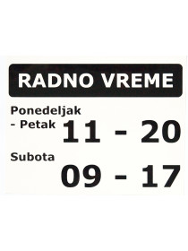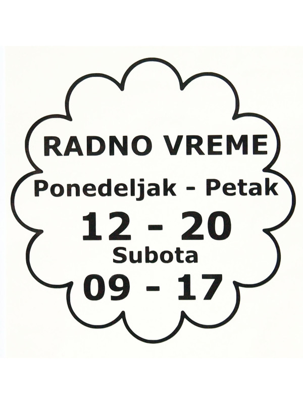 Radno vreme - izrada i prodaja nalepnica za ulazna vrata radnje i firme - dimenzija je oko 19x25 (može biti manja ili veća). Radi sa na samolepljivoj foliji koja se prenosi na ulazna vrata sa spoljnje ili unutrašnje strane vrata tako da samo slovo ostaju. Boju birate prema svojoj želji a raspložive boje su crna, crvena, plava, žuta ili bela.
