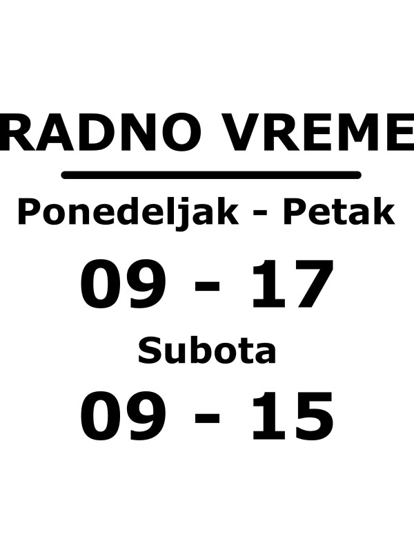 Radno vreme - izrada i prodaja nalepnica za ulazna vrata radnje i firme - dimenzija je oko 19x25 (može biti manja ili veća). Radi sa na samolepljivoj foliji koja se prenosi na ulazna vrata sa spoljnje ili unutrašnje strane vrata tako da samo slovo ostaju. Boju birate prema svojoj želji a raspložive boje su crna, crvena, plava, žuta ili bela.