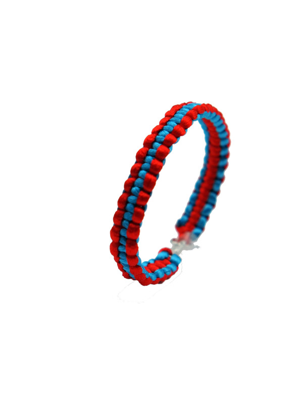 Narukvice u boji - izrada i prodaja - rađene od kanapa u boji sa metalnom vezicom i dve alkice. Boja ove narukvice je plavo-crvena
